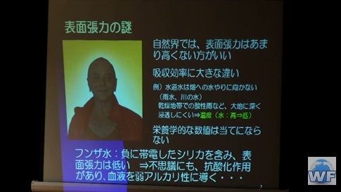 フンザの村というのは、非常にですね、当時はそこに行くのに大変な場所だったんですね。カラコルム山脈の上の方の氷河から流れてきた水を飲んでいました。氷河の水というのは、どんな水かというと、非常に白く濁った水なんですね。そういった水を、飲んでいて、その水が長寿の理由なんじゃないかと。フンザの水は、表面張力がすごく低いというのがありました。