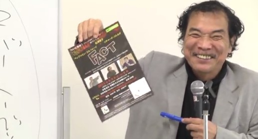 あ、そうだ。今言っておかないとまず忘れちゃう。そこで、ベンジャミン・フルフォードと、ベンジャミン・フルフォードって知ってるでしょ。知ってるでしょ? 怪しい外国人って言っちゃダメだよ。怪しい外国人って言っちゃダメだよ。真面目だよ、あいつ。それでね、今度3人でやるんだよ。配ってる?あ、そうそう、それだよ。なんとね、「FACT」。ベンジャミン・フルフォードと船瀬俊介とリチャード・コシミズ。危険人物三役揃い踏みだよ。ここにね、CIAミサイル撃ちこんだら世界に平和が来るといわれてんだよ。なんなんだ、危ねえなおい。ちょっと、膝が震えてきたよ。