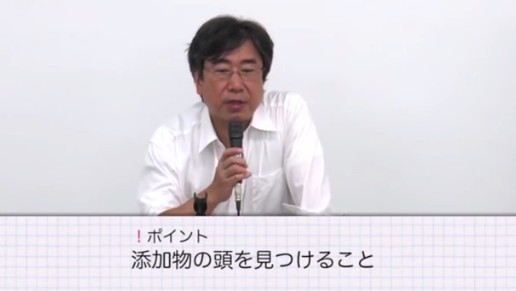 4月からですね、食品表示法ってのが施行されまして、いま機能性表示食品が色々出て話題になってますけども、実はですね、添加物の前に、スラッシュのようなものが今度は書かれることになります。あるいは改行する。あるいは、食品原料と、食品原料は添加物以外ですけども、それと、添加物を別枠に書くというふうなことになります。これからは。ですから、ひと目でわかるようになります。ただし、移行期間が5年なんですね。すごい長いんですよ。ですので、5年ですのでいつなるか、まだわからない。当分は多分、いまのこのよくわかんないような状況が続くと思います。5年後には一応、こう、スラッシュが入るか、改行されるかってことでは一応食品原料と添加物はわかりやすくなるということなんですね。