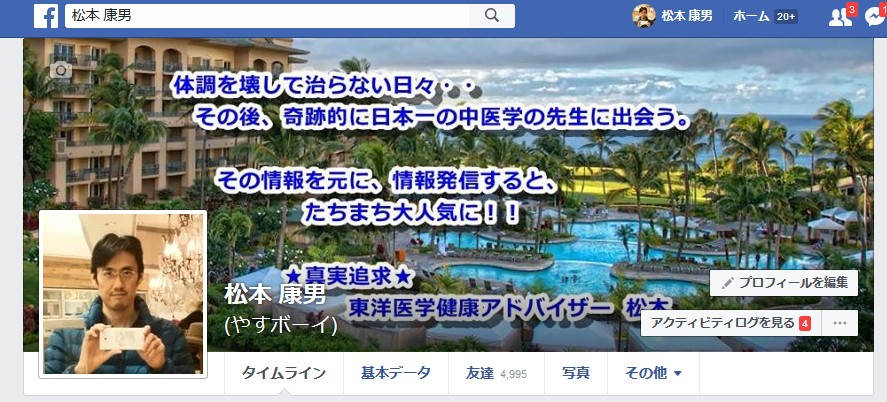 FBでは、「東洋医学健康アドバイザー」として活動している 松本 康男 です。